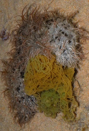 作为没有壳的螺类,不少海蛞蝓的卵也很有特色。比如在我国东南沿海有一种蓝斑背肛海兔,它们的卵包裹在长长的卵群带里,缠在石块、藻类等物体上。这种卵带俗称为“海粉丝”,是一味中药。
