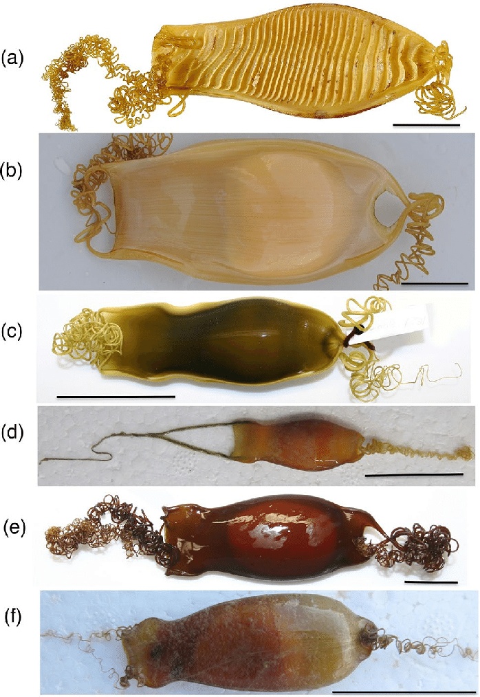 根据种类不同,软骨鱼的卵鞘也有不同的款式,比如,猫鲨的卵鞘是水壶状的,鳐的卵鞘是方形的,而虎鲨的卵鞘则是螺旋状的,不管是哪种形状,软骨鱼的卵鞘一般表面都长有卷须或其他的附属结构,可以缠在海草、藻类、石块等物体上,以避免被水冲走。