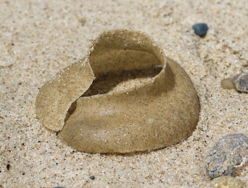 其实,这是玉螺的卵袋。玉螺,也就是俗称的“猫眼螺”,是沙质潮间带上的常客。在产卵时,玉螺会将自己的卵包裹在一个胶质的卵囊中,然后这个卵囊粘上沙粒,便成了上图的样子,看起来像个破了底的小碗。
