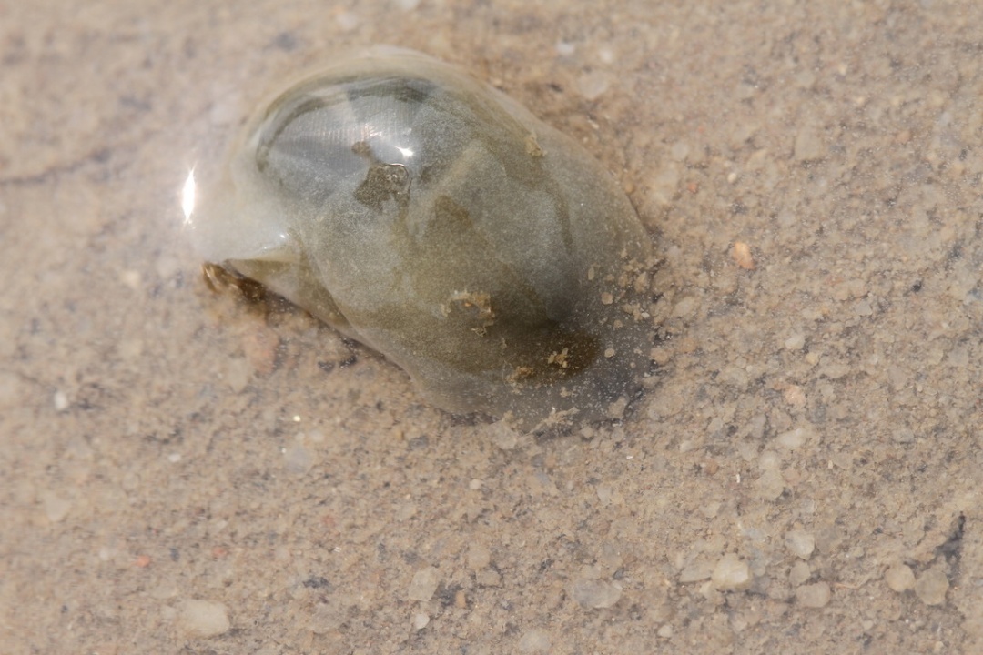 除玉螺外,许多生活在沙地上的螺类也贯彻了类似的生存策略,比如我国沿海常见的泥螺,它们的卵就包裹在一个巨大的透明胶质卵囊中,这个卵囊虽然也相对轻盈,但比起单个的卵来说还是稳重多了,就算被冲上沙滩,其中的水分也有很大概率让卵撑到被下一轮潮水带回海中。