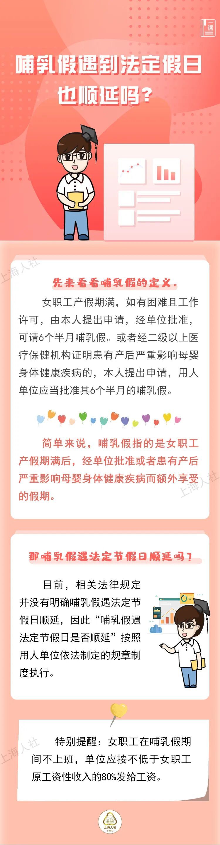 小金去年10月中旬开始休产假和生育假,本月小金的生育假即将结束,最近她向单位提出继续休6个半月哺乳假到今年10月,并附上了医院的证明。经单位批准,小金从4月1日开始休哺乳假。听说,有一些假期遇法定节假日可以顺延,那哺乳假呢?关于这个问题,一起来看解答!