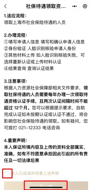 3. 认真阅读办理流程、注意事项和重要申明后,勾选“本人已阅读并同意上述声明”,并点击“下一步”。