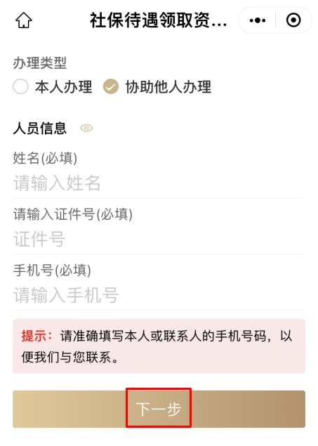 ②如需协助家人或朋友办理,办理类型请选择“协助他人办理”,准确录入他人的姓名、证件号和手机号码后,点击“下一步”。