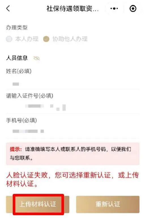 7. 如页面提示“人脸认证失败”,您可以点击“重新认证”按钮,再次进行人脸识别认证;或点击“上传材料认证”按钮,按提示上传申请材料。