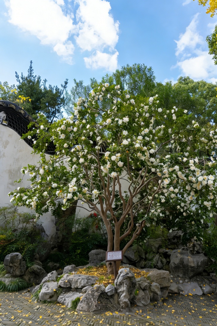 眼下,在豫园的点春堂旁,一株编号0896的古树,作为上海古树名木中独一份的茶梅,亦是豫园内唯一的名木,正以满树琼花,在冬日里绽放着时光淬炼的美好。