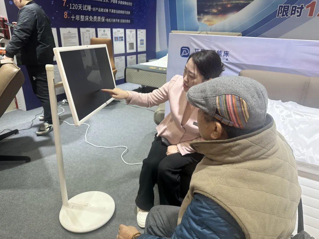 智能家居成为本届展会亮点。在艾度智能床展位,销售程凯正为市民胡先生介绍一款适老化智能床。胡先生老伴因中风瘫痪在床,他特意前来挑选一款智能床。“床垫可以分区调节,还能监测睡眠。”程凯介绍,他们也可根据顾客需要定制适配,“展会价格基本为工厂批发价,比门店便宜三四千元。”