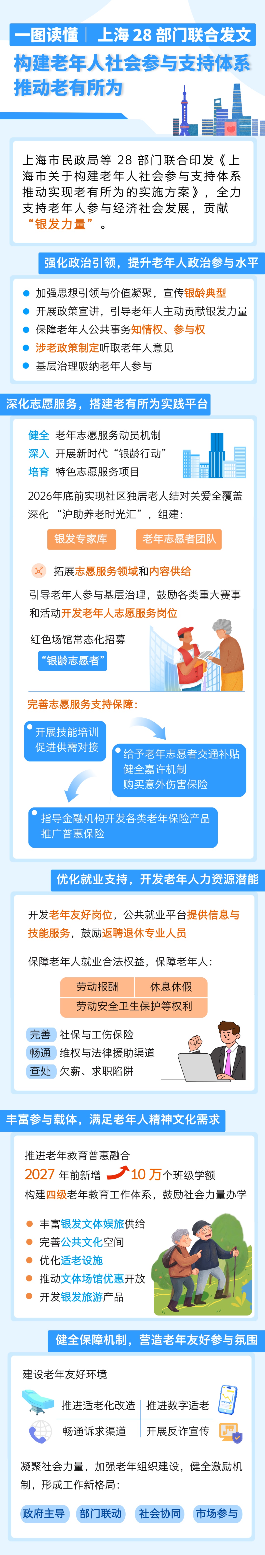 市民政局介绍,上海28部门联合出台实施方案,围绕志愿服务、就业支持、老年教育、便民服务推出多项实招,让老年人既能发挥经验优势贡献 “银发力量”,也能安享便捷温暖的晚年生活。