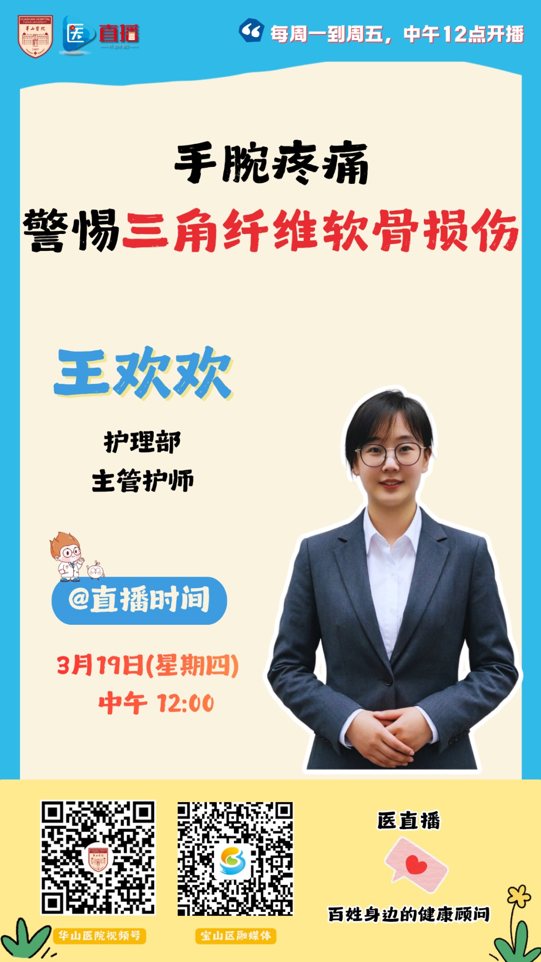 你是否经常感到手腕小拇指一侧疼痛?拧毛巾、开瓶盖、提重物时疼痛加剧,甚至旋转手腕时有“咔哒”声?别只当是普通扭伤,这可能是三角纤维软骨复合体损伤在作祟。无论您是运动爱好者、上班族,还是长期家务劳作者,都可能面临手腕疼痛风险。本期医直播,复旦大学附属华山医院护理部主管护师王欢欢,教您科学护腕,重获灵活双手。