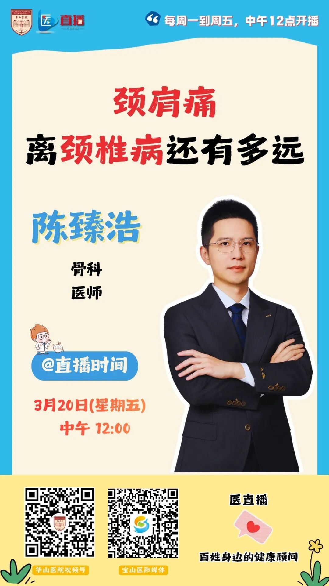 脖子僵硬、肩膀酸沉、转头时“咔咔”作响——这些感受,您或许再熟悉不过。直到某天脖子突然动不了,才开始怀疑:自己是不是得了颈椎病?本期医直播,复旦大学附属华山医院骨科医师陈臻浩,将带您了解什么是颈椎病、颈肩痛的真正含义,以及日常生活中如何有效防治颈椎问题。
