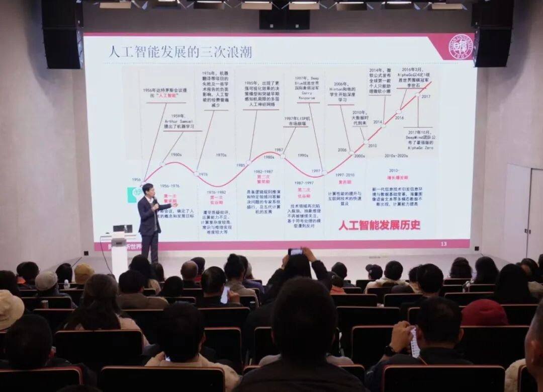 讲座现场座无虚席,不少青少年学生和成年市民慕名前来聆听。本次讲座依托“科学起跑线”丛书中的《探索AI新世界》展开,该书作者、复旦大学计算与智能创新学院副教授、复旦大学人工智能教育教学创新中心副主任朱东来担任主讲人。他从人工智能发展史切入,依托知识框架,梳理三大技术路线、核心技术成果及多元应用场景,结合个人生活、科研领域的真实案例,全方位科普AI知识,让高深技术变得浅显易懂。