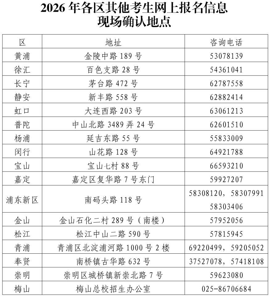 现场确认:考生完成网上报名报考后,须进行报名报考信息的现场确认。若未在规定时间内完成确认,视为本次报名报考无效。现场确认时间为4月10日至4月11日(9:00至11:00,13:00至16:00),请考生与家长持网上报名所用的有效证件和初中毕(结)业证书[年满18周岁的考生可不提供初中毕(结)业证书]原件及复印件到报名地所在的区招考机构办理现场确认手续,现场确认地点详见下方↓。考生和家长应仔细核对报名报考信息确认表上的信息,并签字确认。