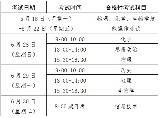 其中,物理、化学、生物学技能操作测试,以及信息技术科目的具体考试时间以准考证为准。