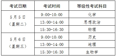 5月等级性考试设思想政治、历史、地理、物理、化学、生物学6门科目。考生可根据高校招生要求和自身兴趣特长,在6门等级性考试科目中自主选择3门参加考试。