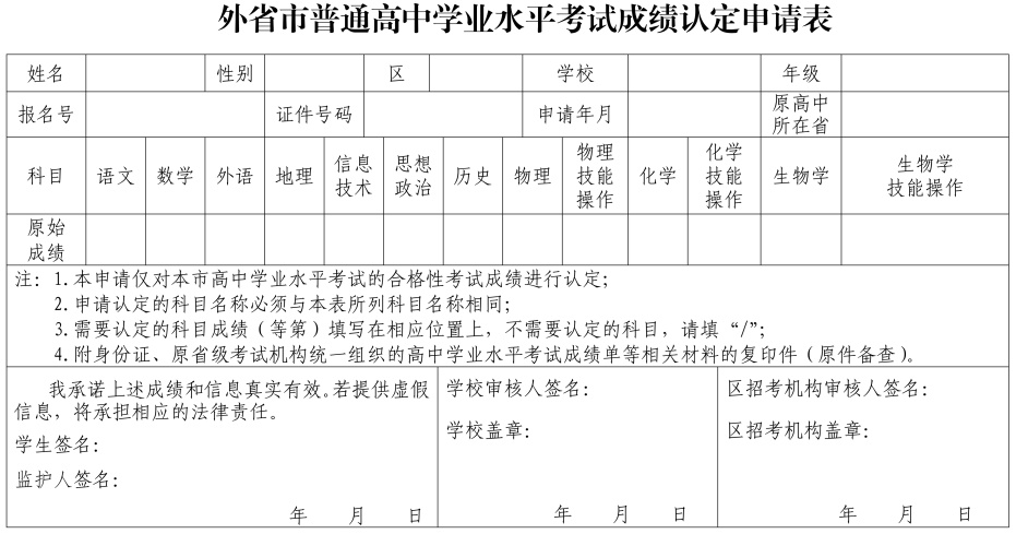 未转学进入本市普通高中就读的其他考生如需申请外省市成绩认定,可参照外省市成绩认定管理办法执行。其他考生持省级考试机构统一组织的高中学业水平考试成绩证明或成绩单等相关材料原件和复印件、身份证原件和复印件于3月26日至3月28日(9:00至11:00,13:00至16:00)到报名地所在的区招考机构提交申请,填写《外省市普通高中学业水平考试成绩认定申请表》(见附件2)。区招考机构通过考试管理系统进行外省市成绩认定申报。