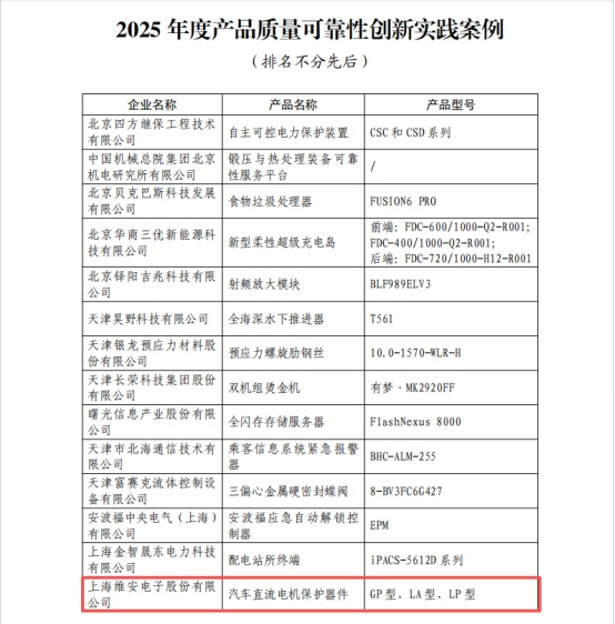 日前,上海市市场监管局等八省、直辖市市场监督管理局(委员会)公布2025年度产品质量可靠性创新实践案例名单。在虹口区市场监管局指导推荐下,虹口企业上海维安电子股份有限公司的产品“汽车直流电机保护器件”(GP型、LA型、LP型)上榜。