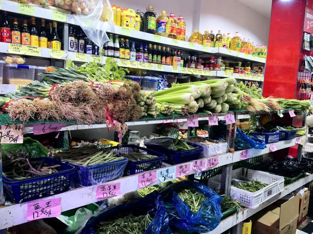 傍晚时分,菜店客人络绎不绝。刚接完孩子的家长牵着小孩进来,大人选菜,小孩东看西看,像一场小小的自然探秘。“大排炖上了,才发现屋里厢么葱……”还有很多人匆匆而来,拿一板鸡蛋,称一颗花菜,或者只是一把小葱,买完就走。鸡蛋就摞在门口最显眼处。灶台后的调味料会跟着季节换——冬天是火锅底料,夏天换成卤肉料包。菜店深处的肉摊上,每样不多,却种类丰富,偏爱某个牌子的肉,还可以跟老板定,下一次进货就给安排上。店内所有售卖的菜品、调料都明码标价。