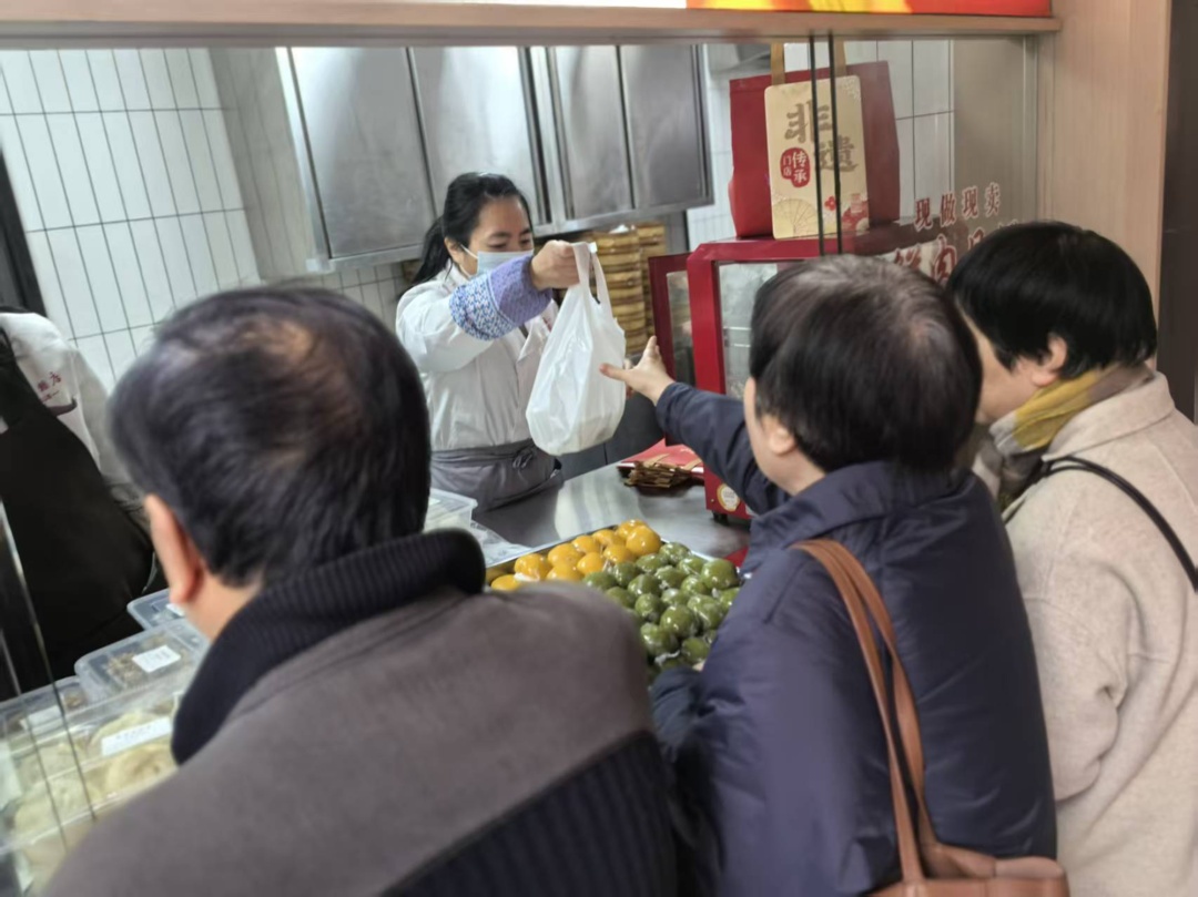 “我们老年人比较喜欢吃这种素馅的青团,口感清爽一点。”住在老西门附近的吴老伯特地来到上海德兴馆复兴荟店,买上几只新鲜出炉的松子马兰头青团,当天现制的青团还带着丝丝余温。考虑到家人的口味偏好,他还购买了陈皮豆沙、咸蛋黄肉松青团。一盒六只整整齐齐的“绿胖子”带着满满的春意,让人食欲大涨。