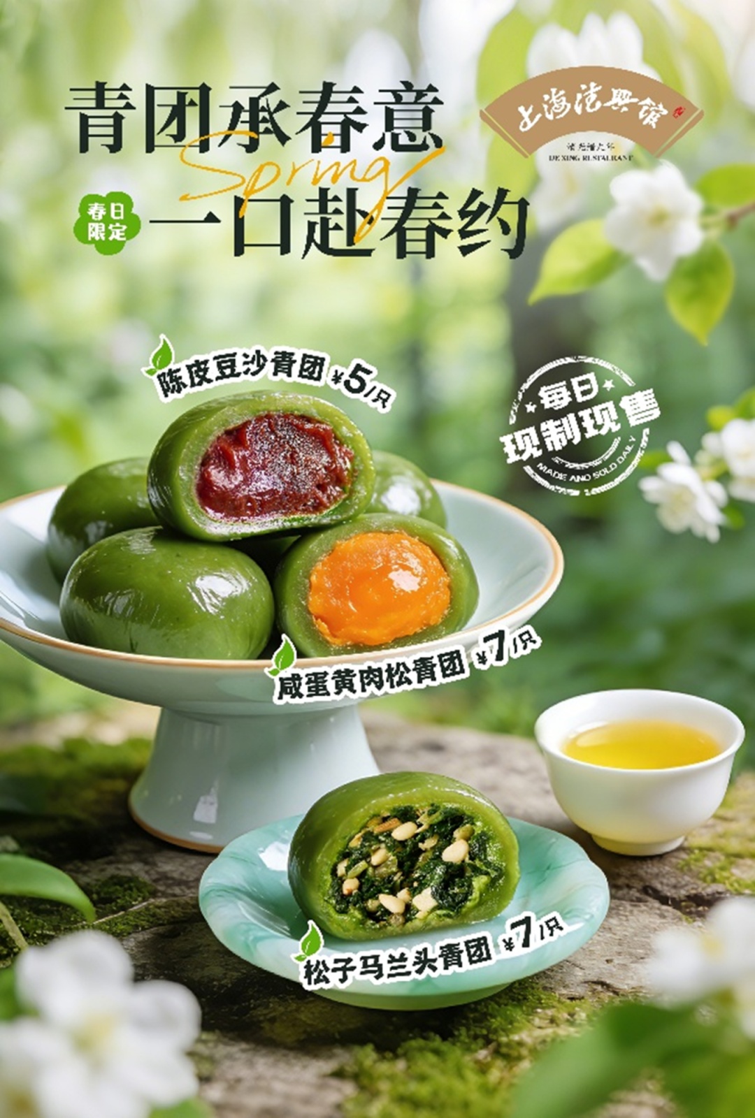 同样坚守时令传统的还有中华老字号上海德兴馆。最近他们家的青团也在所有门店陆续上市了,其中富有春味的松子马兰头青团最受老食客欢迎。油润的松子颗颗饱满自带香气,配上当季的鲜嫩马兰头,咬上一口,清脆的口感携带着春日的气息扑面而来,令人唇齿生香。