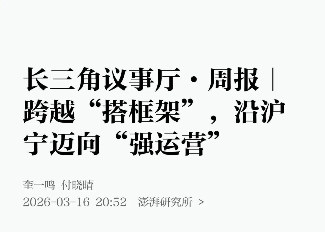 3月16日,澎湃研究所在《长三角议事厅·周报》刊发报道:跨越“搭框架”,沿沪宁迈向“强运营” 2026年开春,沿沪宁产业创新带的微观“水温”正在悄然升高。 一边,是普陀万里街道商会与苏州吴江区商会签下跨城合作共建协议;另一边,沿沪宁线上协同创新集市技术交易额突破2100万元,近百名技术经理人活跃在沪宁沿线,为技术、资本与场景“穿针引线”。这些看似分散的动作,拼接起来却指向同一个变化:这条串联沪苏九市、以不到全国0.6%的土地面积贡献全国约11.85%GDP的创新轴带,正在加快跨越以签协议、开会议、搭机制为主的“搭框架”阶段。 普陀万里街道商会与苏州吴江区商会签下跨城合作共建协议 真正决定沿沪宁产业创新带成色的,已不是再签多少备忘录、再办多少大会,而是能否把资源清单转化为项目池,把协同机制做成服务平台,把技术经理人、科创飞地和园区载体串联成顺畅高效的成果转化链条。下一程的关键,不在于把框架搭得更大,而在于能否更快把协同优势转化为运营效能,真正迈向以市场机制为牵引、政企社多元协同的“强运营”。