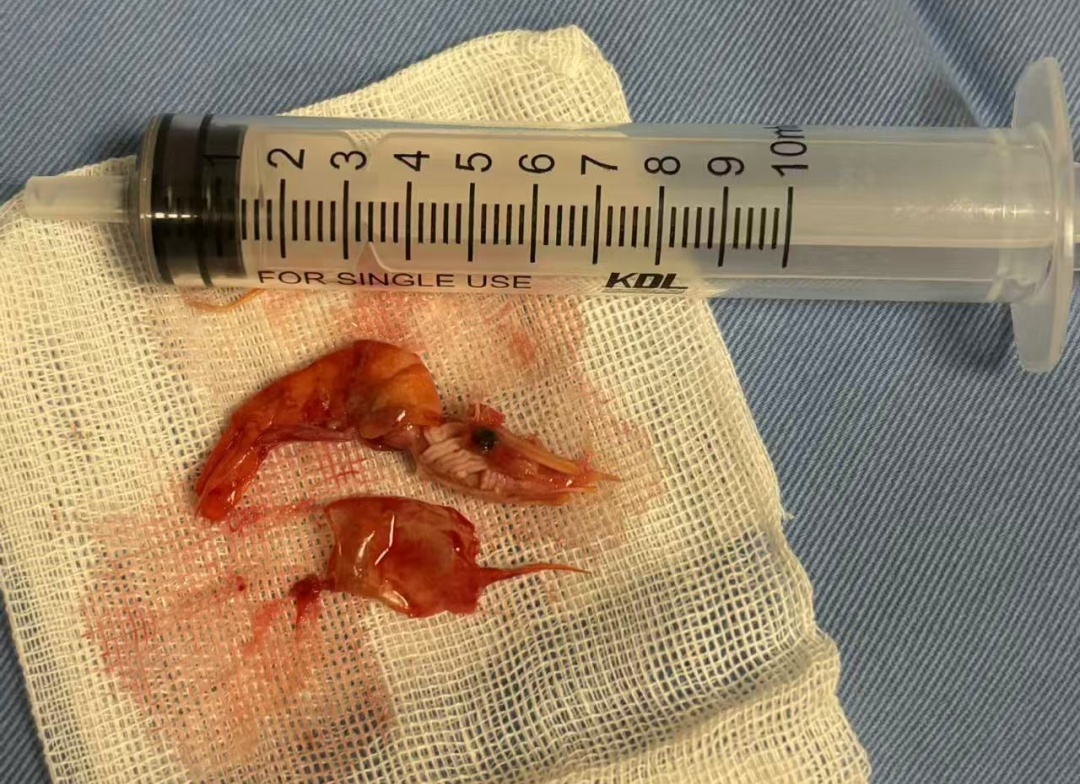 在支气管镜下,医生精准定位、小心操作,仅用6分钟,就将这只卡在气道内的完整河虾顺利取出。术中刘阿姨生命体征平稳,术后恢复良好。