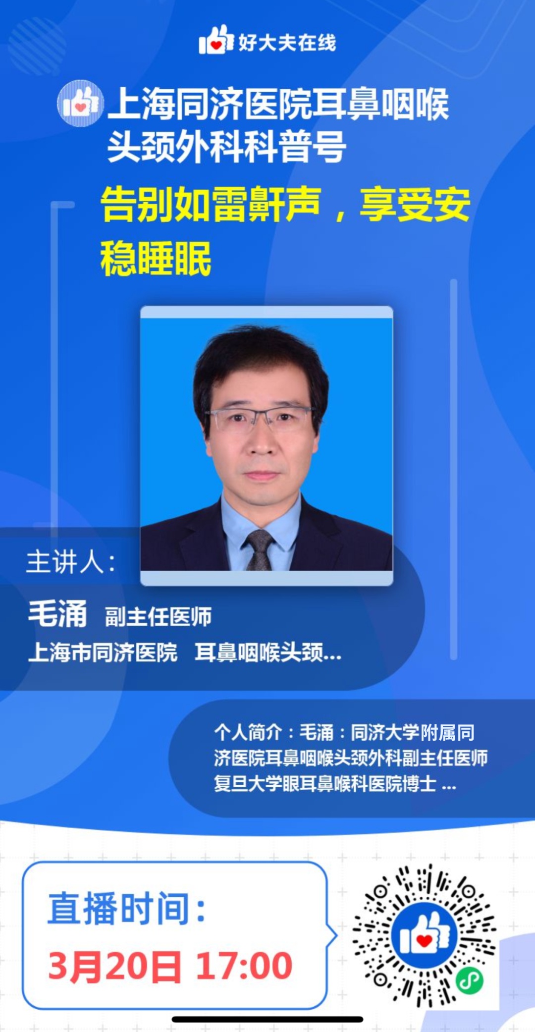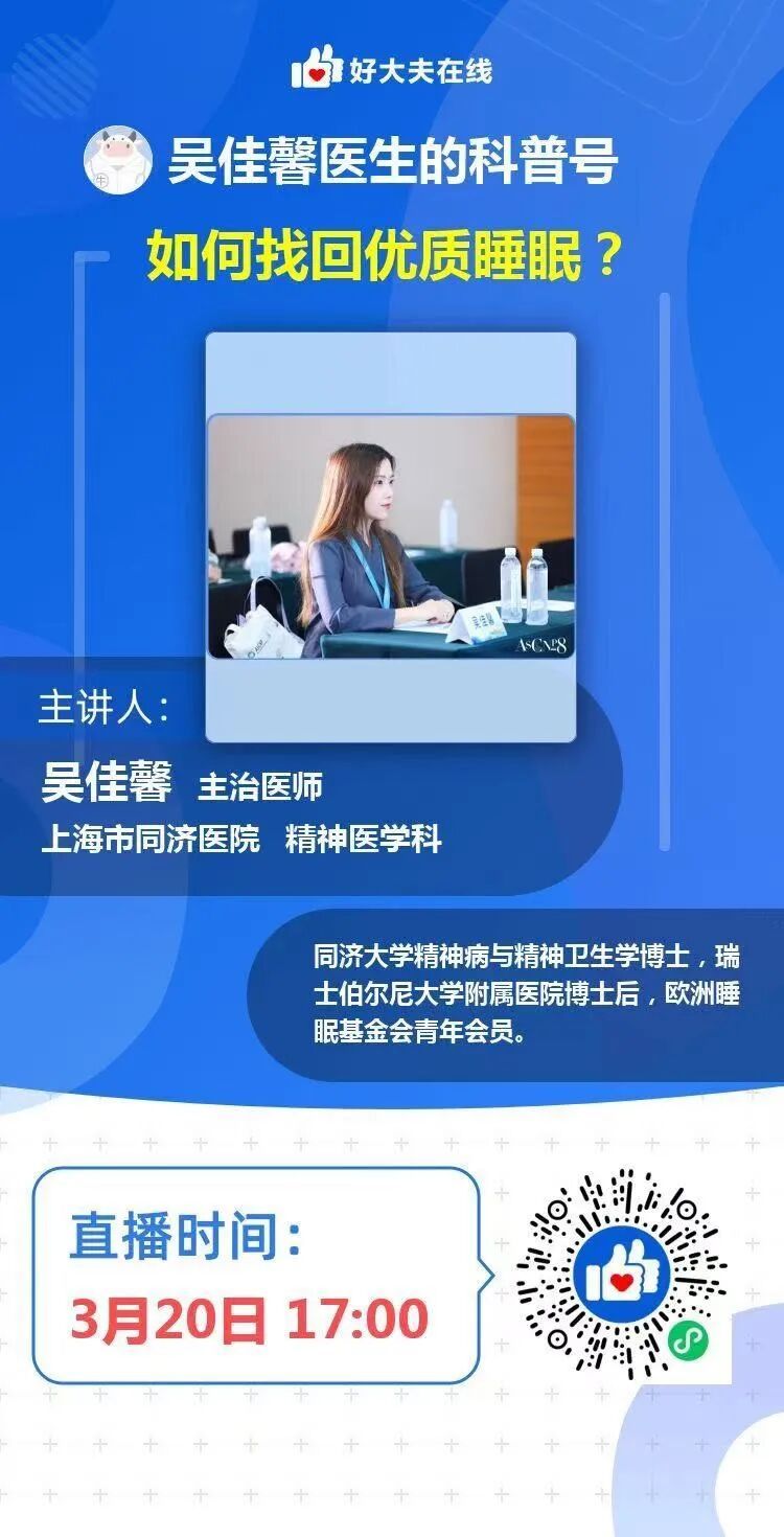 2026年3月21日是第26个“世界睡眠日”,今年的主题是“优质睡眠,美好生活”,同济大学附属同济医院将于3月20-21日在线上开展专家科普活动。