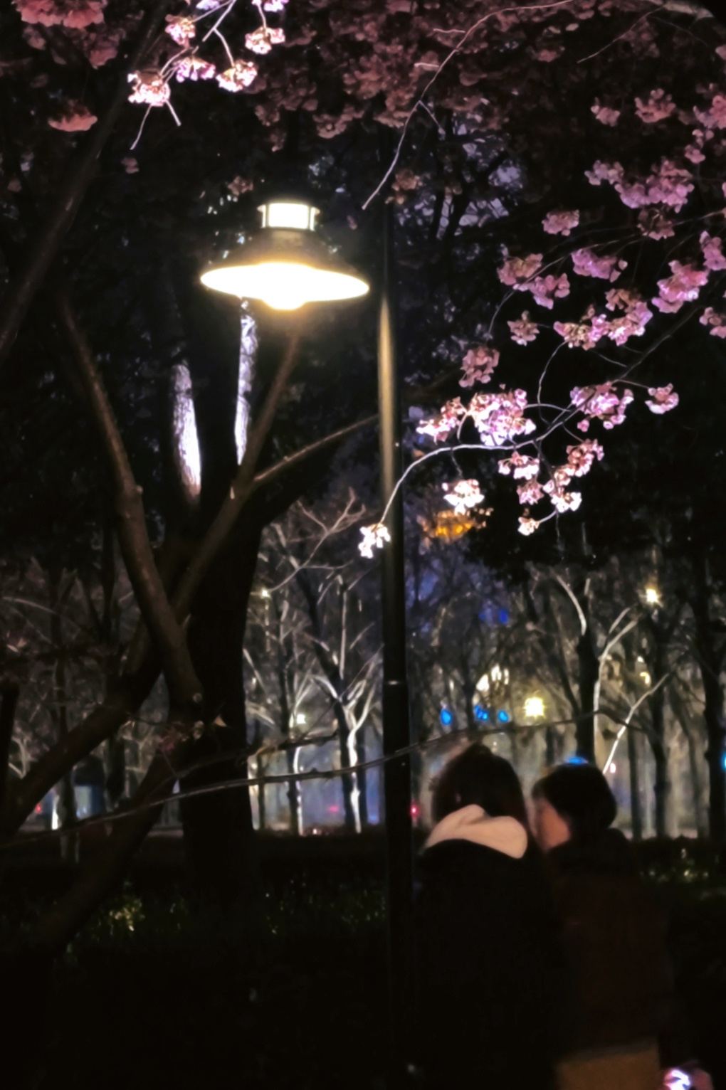 而等天色完全暗下来,蓝调氛围便悄然退场——另一种浪漫接替登场。夜色更浓,樱花更显清冷,整条樱花小径被暖光包裹,静谧得像童话世界的入口。