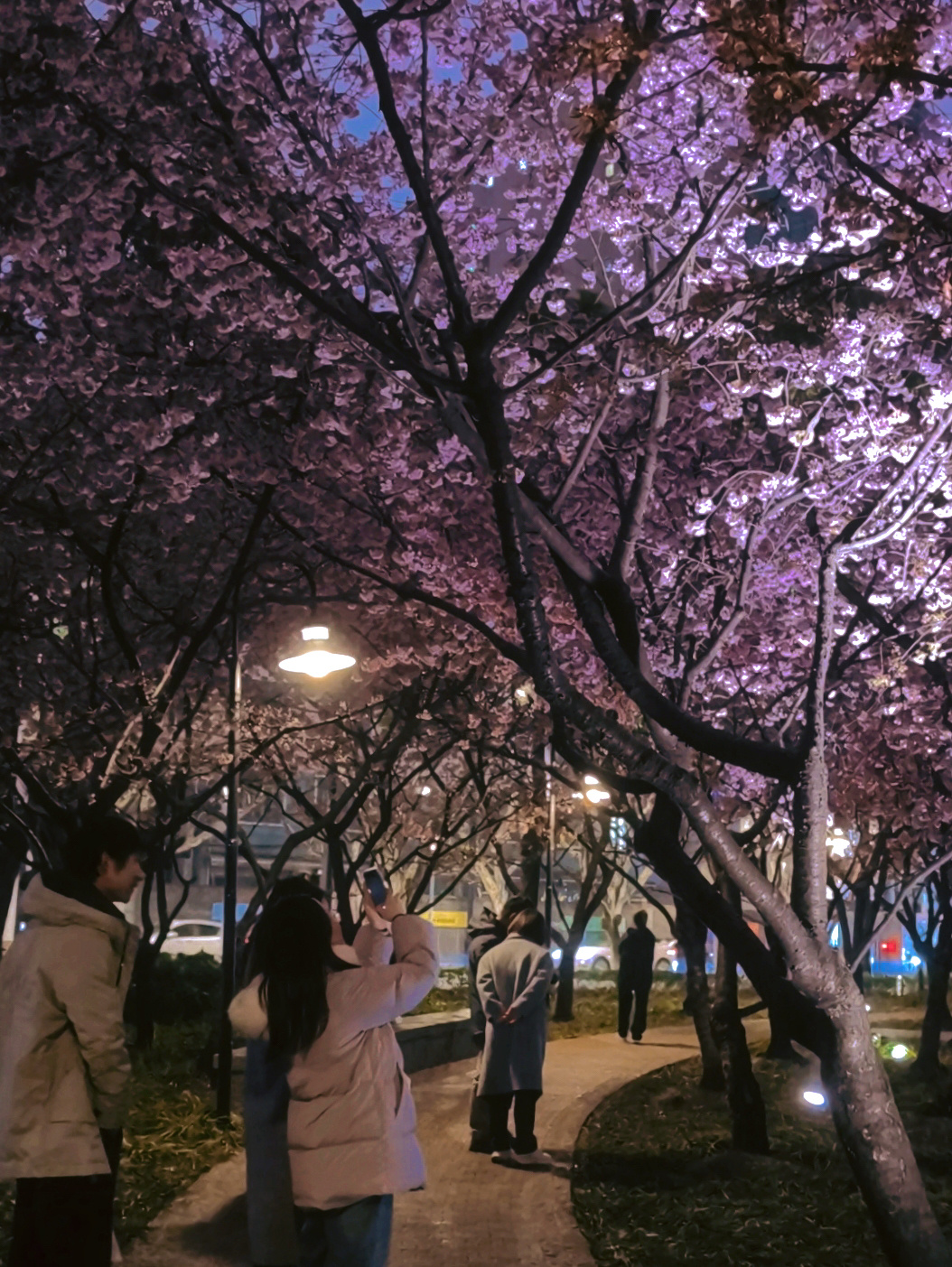 地上的射灯亮起,光束从下往上打亮花枝;路边暖黄色的路灯也加入进来,在花瓣上镀一层温柔的光晕。天光、灯光、花色,在这一刻达成微妙平衡。
