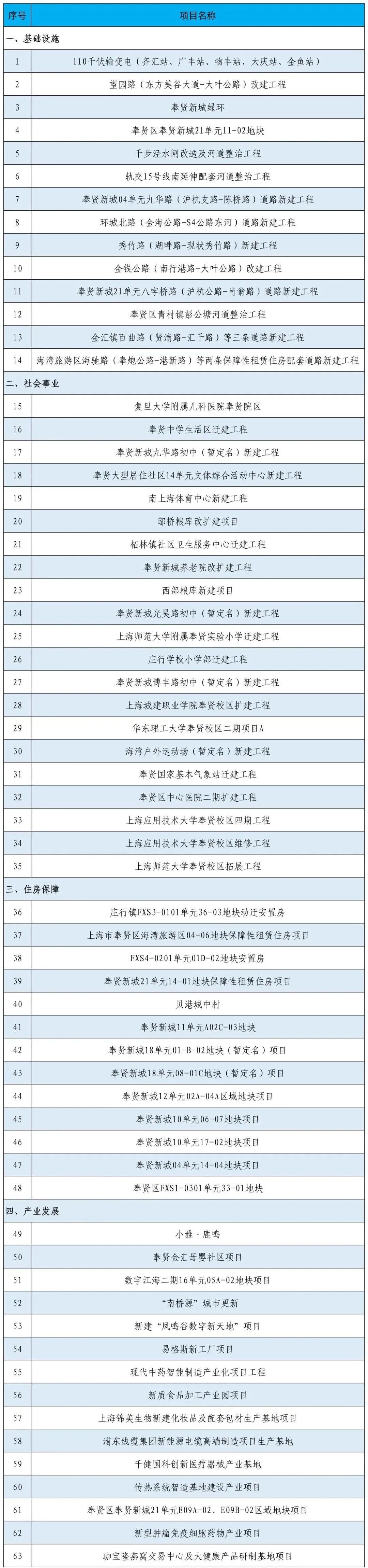 按照区委、区政府工作部署和总体要求,聚焦新城建设、社会民生、基础设施、城中村改造、轨道交通、四大特色产业等重点领域,经研究,2026年奉贤区重大工程项目建设计划共安排正式项目63项、重点关注项目4类9大项。