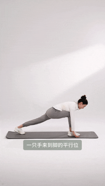 动作要领:面向垫子站在尾部,肩膀下沉,双脚踩实。右脚向前迈一步来到弓步(注意前后腿不要在同一直线上,需一左一右站开以保持身体稳定)。重心在中立位,单手来到前脚的平行位。外侧的手向外侧打开,向上延长伸展。在这个位置保持呼吸,随后吸气收回。