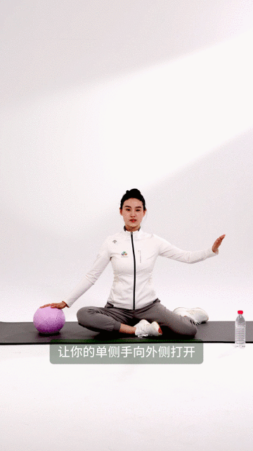 动作要领:左腿向外侧打开,右腿向内收(做不到此坐姿可改为盘腿坐)。坐骨向下坐实。单侧手向外侧打开,将小球放在手掌下向下压住。呼气时,另一侧手向远推延伸,感受侧腰完全拉伸;吸气时再收回。
