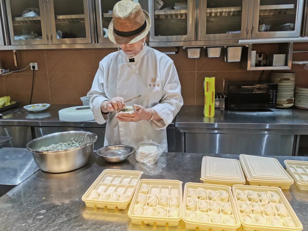 中午11点,记者走进店内的开放式厨房,只见师傅们正忙碌地“变魔术”——一只只形似“元宝”的刀鱼馄饨,正被精心包裹,整装待发!眼下正是品尝刀鱼的黄金时节!为了锁住这稍纵即逝的鲜美,龙燕楼的厨师天没亮就开工,精选新鲜海刀鱼肉,细细剁碎,搭配肥瘦相间的猪肉提香,再佐以清香的荠菜点睛。这一碗下肚,鱼肉的嫩、猪肉的醇、野菜的鲜,三重口感在舌尖炸裂,简直是营养与美味的双重享受!“刀鱼本来蛋白质含量很高,但是它油脂可能会缺少一点,所以我们加入黑毛猪的猪肉以及当季的荠菜,最大程度地提升它的鲜度。”饭店厨师长向记者说道。