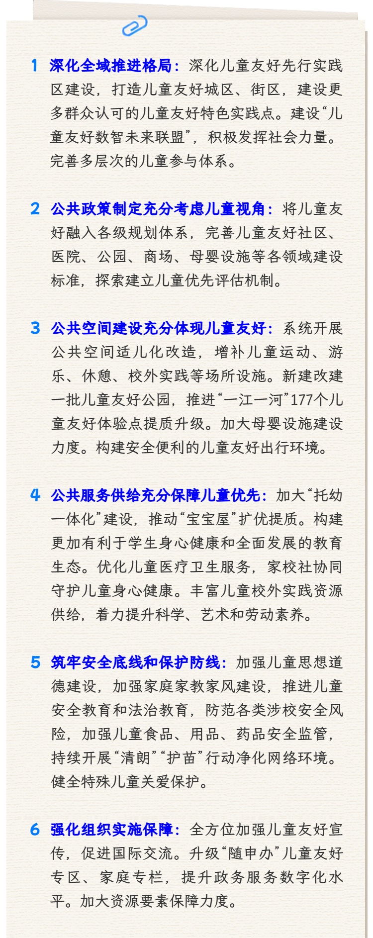 据市发展改革委介绍,《上海市推进儿童友好城市建设三年行动方案(2026-2028 年)》近日发布。新一轮行动方案强调下一步要深化儿童友好建设全域推进格局,将儿童优先原则落实到公共政策制定、公共空间和设施建设、公共服务供给等方面,筑牢安全底线,守护广大儿童健康安全成长。
