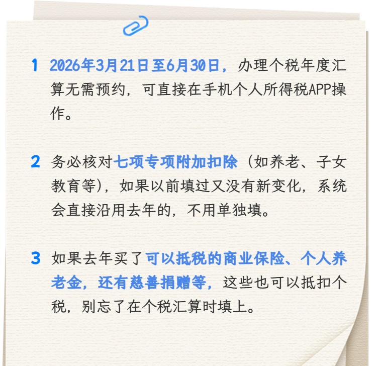 2026年3月21日起,2025年度个税汇算无需预约,可随时办理。那么应该如何办理?专项附加扣除都有哪些?办理时有哪些常见问题?搞懂这些填报要点,帮你轻松完成个税汇算。