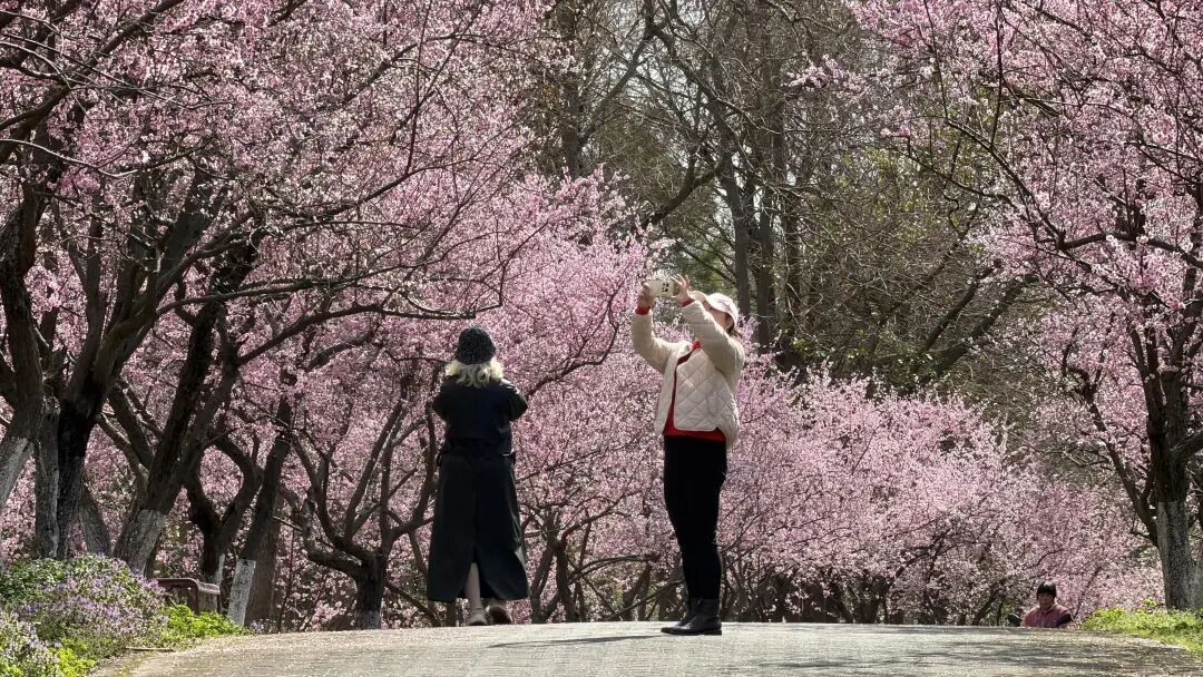 梅林深处,宋梅厅前,摄影打卡点成为人气最旺的地方。一家三口站在古梅树下,春风拂过,花瓣轻落肩头,快门声响起,定格下这个春天的温暖瞬间。樱花园里,几株早樱已悄然绽放,粉白相间,与梅花的深粉浅红交相辉映,孩子们在花树下奔跑嬉戏,家长举着手机追拍,笑声洒满林间。