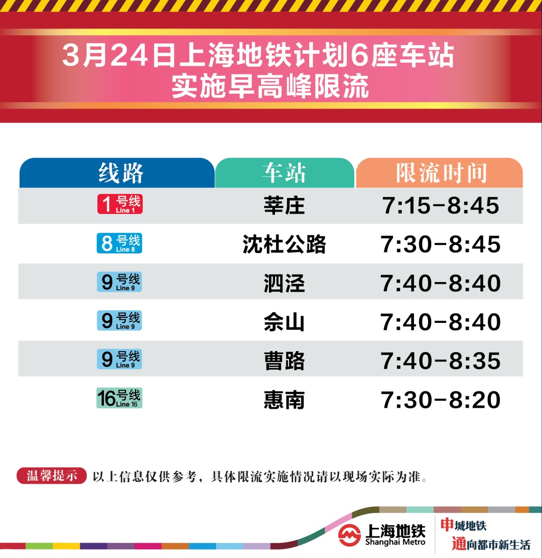3月24日早高峰莘庄、曹路等6座地铁站计划限流