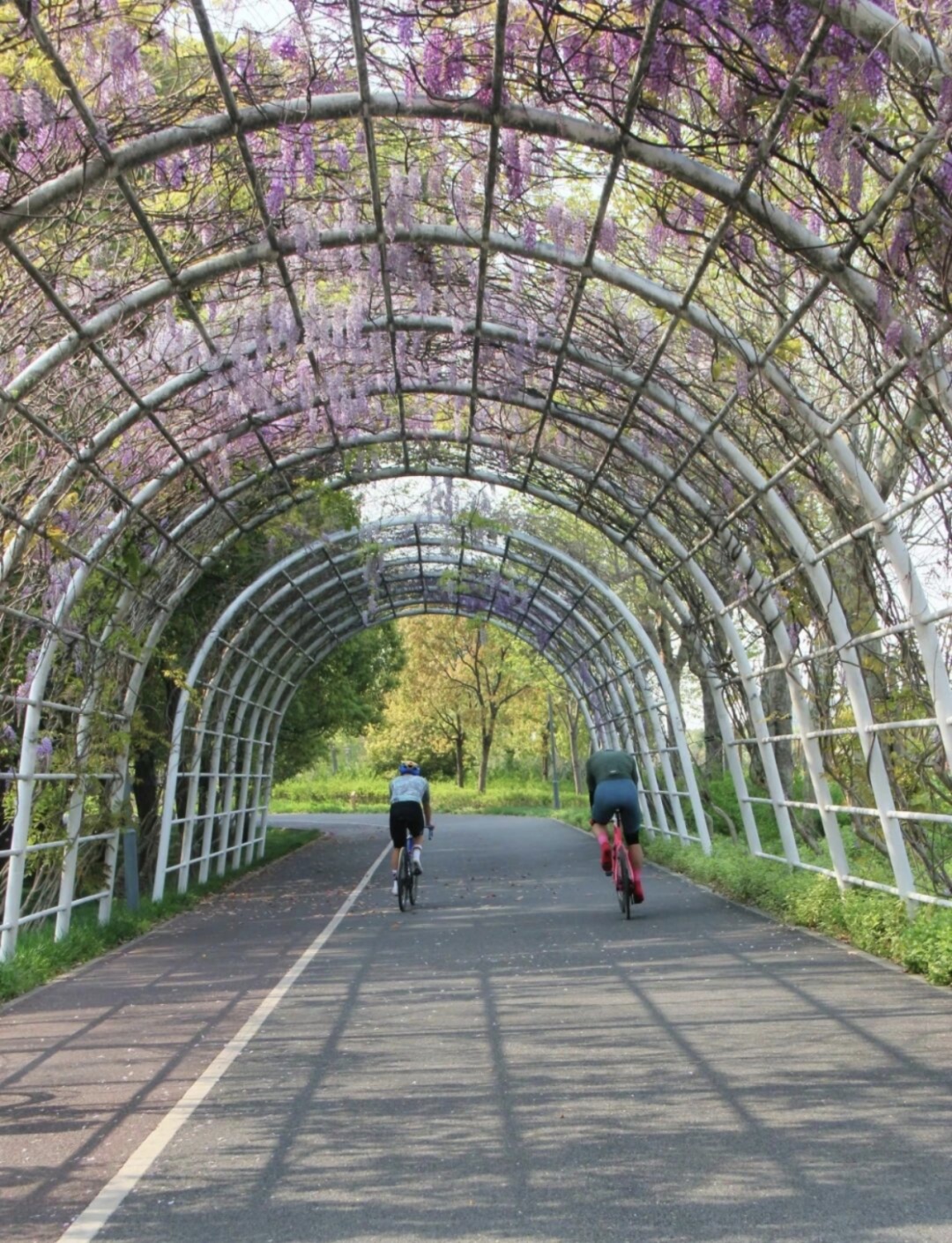 ✨亮点:大片紫藤垂成紫色花瀑,步道安静,骑行/步行都舒适