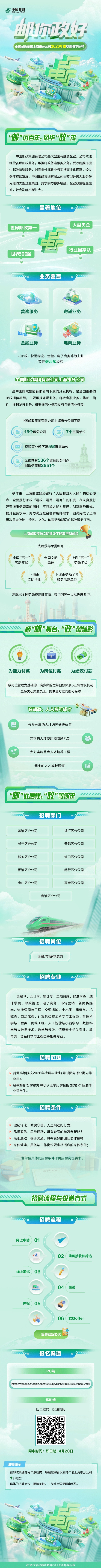 中国邮政集团上海市分公司2026年度校园春季招聘即日起至4月20日开启报名具体流程详见↓期待着每一个你的加入!不负韶华,未来“邮”你来中国邮政大展身手“政”当时!