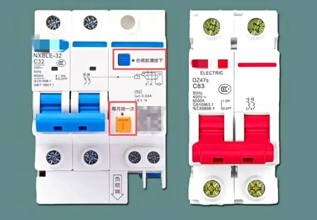 漏电保护开关:多了一个蓝色小方块(复位键)和一个“T”键(测试键)。要是发生触电、火线接地等情况,它会立刻跳闸,对人身安全的保护更强。