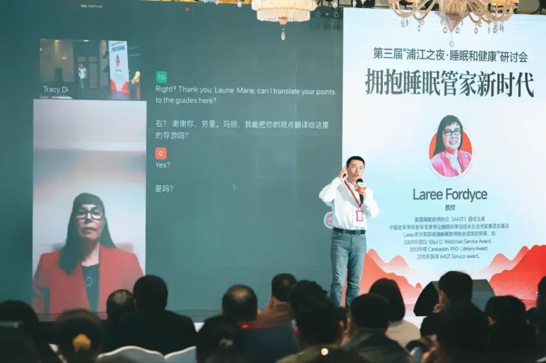 在互动环节,乙十睡眠互联网医院院长于剑扉博士通过视频连线,与远在加拿大的美国睡眠技师协会前任主席Laree Fordyce围绕“全球视野下的睡眠管理”展开深入交流,并现场解答了观众关于“睡眠管家”的提问。