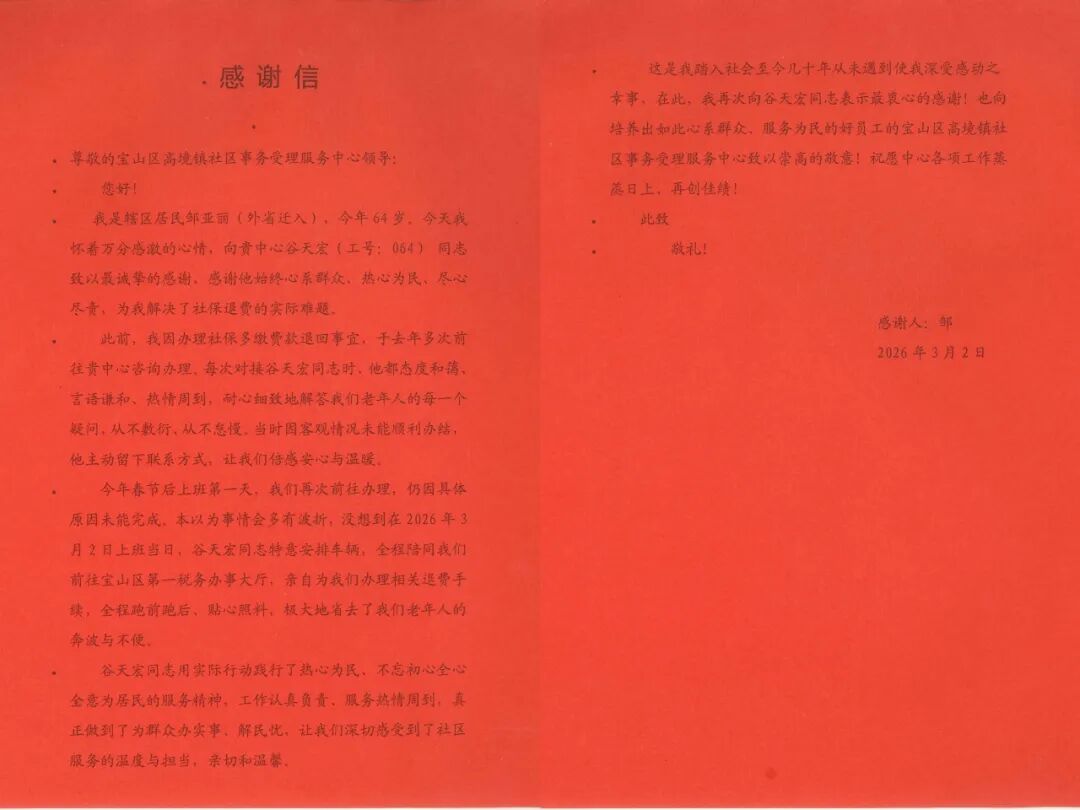 “这是我踏入社会至今几十年从未遇到、使我深受感动之幸事。”近日,宝山区高境镇社区事务受理服务中心收到了一封饱含深情的特殊来信,字里行间流淌着一位长者最真挚的感激之情。来信人邹阿姨不仅对中心工作人员谷天宏贴心周到、认真负责的政务服务赞不绝口,更由衷地为基层窗口所传递出的温暖与担当竖起了大拇指。 这份感动,要从一件困扰邹阿姨许久的“烦心事”说起。作为一名外省迁入上海的居民,邹阿姨因对社会保险缴费政策不够了解,意外多缴了社保费用。如何退回这笔钱,成了压在她心头的一块“石头”。多次来到中心咨询,每次接待她的都是窗口工作人员谷天宏。 面对老人的反复询问,谷天宏始终保持着温和的态度,耐心细致地逐条讲解政策,逐项梳理办理该业务的所需材料,并未因业务复杂而有半分敷衍与怠慢。为了让老人少跑腿,他还主动留下自己的联系方式,轻声叮嘱:“有问题随时打我电话。”这一句朴实的话语,让邹阿姨原本焦虑的心,渐渐安定了下来。 春节后首个工作日,邹阿姨再次来到中心,经了解,退费业务需前往税务部门办理,考虑到老人年事已高、独自办理确有困难,谷天宏主动提出安排车辆,全程陪同邹阿姨前往宝山区第一税务办事大厅。一路上,他跑前跑后,细心照料着老人;到了办事大厅,他又协助邹阿姨办理退费手续,每一个环节都处理得井井有条。他用实际行动,切实解决了老年人办事路途遥远、流程不熟悉等难题,真正做到了把便利留给群众,把责任稳稳地扛在肩上。 一封表扬信,不仅是一份简单的认可,更是一份沉甸甸的信任。谷天宏用自己的真心,换来了群众的舒心,用实实在在的行动践行着“全心全意为人民服务”的初心使命,充分展现了高境镇社区事务受理服务中心工作人员爱岗敬业、心系群众的优良作风。 展望未来,高境镇社区事务受理服务中心将继续以先进典型为榜样,把每一位群众的“小事”当作心头的大事来办,用更贴心、更高效、更有温度的服务,不断提升居民的获得感、幸福感和满意度,让政务服务的阳光,照进每一位群众的心坎里。 通讯员:施丹 编辑:张博宇 资料:高境发布 *转载请注明来自上海宝山官方微信
