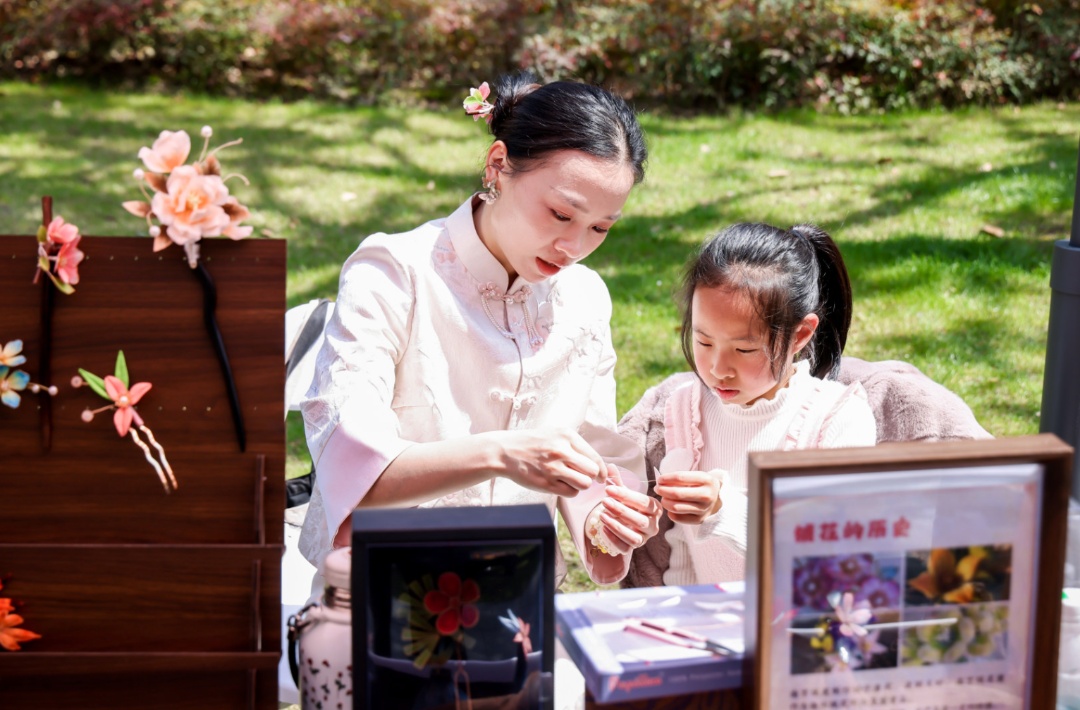 非遗绒花手艺人邹女士的摊位前围满了人,她拿着精致的绒花作品向大家介绍道:“绒花的谐音是‘荣华’,有荣华吉祥的美好寓意。这朵牡丹绒花要经过拉丝、打尖、传花等十多道工序才能做成,每一朵都是独一无二的。”市民陈小姐拿起一朵绒花,轻轻触摸质感:“太精致了,不仅好看,还有这么美好的寓意,买一朵回家,既能装点生活,也能感受非遗的魅力。”