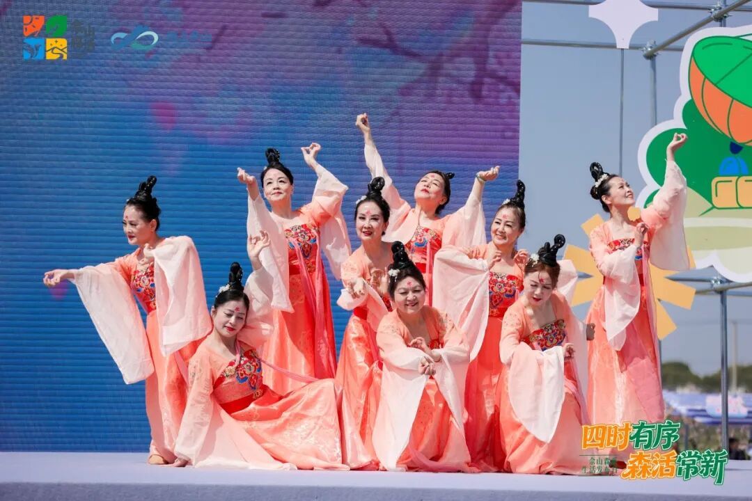 活动现场氛围清新热烈,开场舞《元气森活》活力满满,佘山文旅宣传片与品牌片轮番放映,全方位展现佘山生态之美、人文之韵与生活之趣。串场舞蹈《春韵霓裳》唯美演绎,将自然诗意与生活温润完美融合。