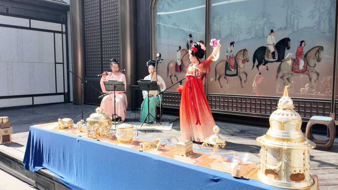 活动现场,随着一缕清雅熏香缓缓飘散,拉开了音乐会的序幕。婉转悠扬的琵琶声、清脆空灵的笛声,古典民乐声声入耳,奏出独属于盛唐的雅致韵律。身着精美汉服的演职人员身姿曼妙,伴着乐曲翩翩起舞,一颦一笑尽显古风雅致。