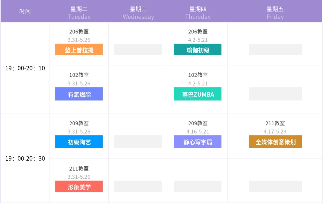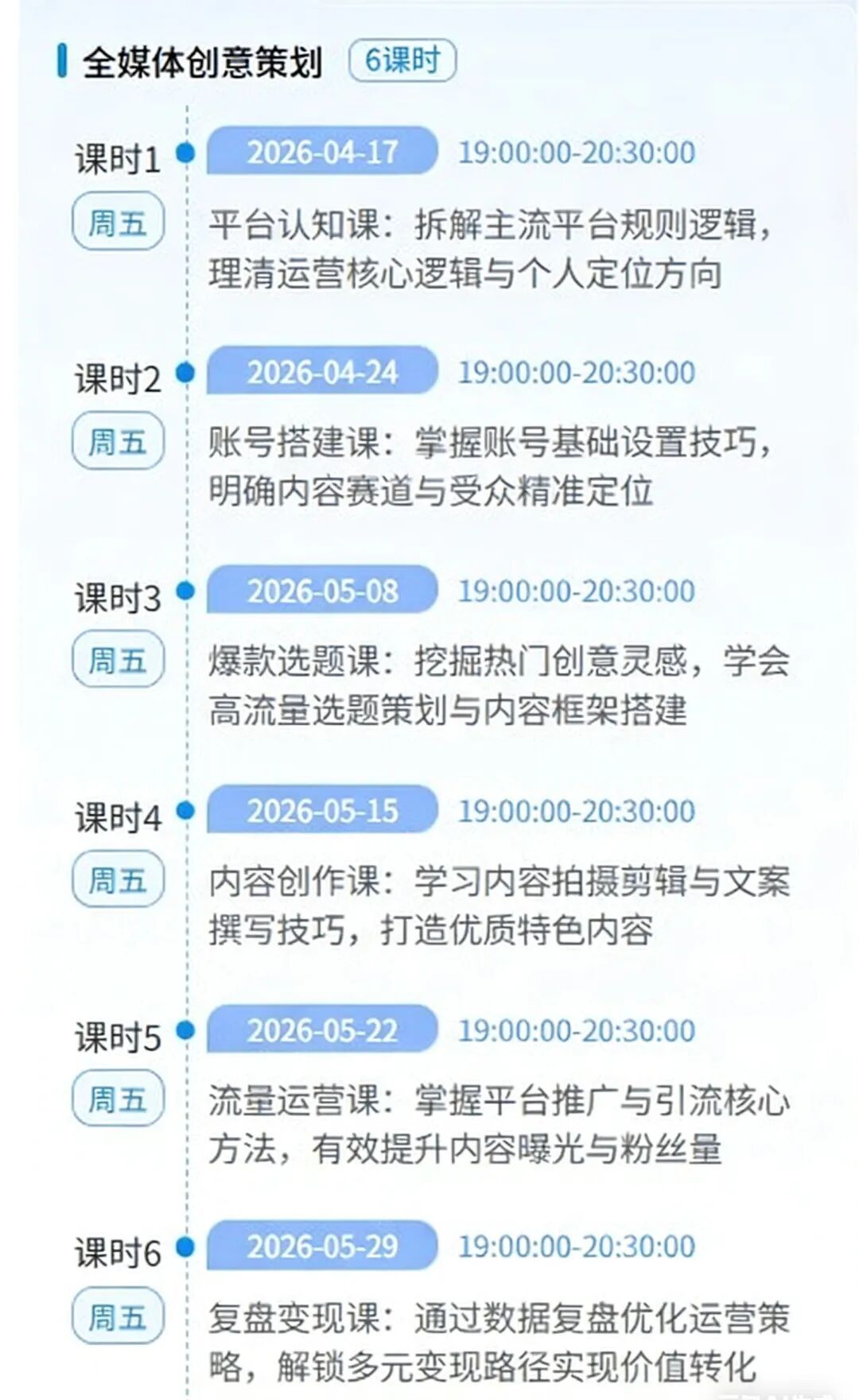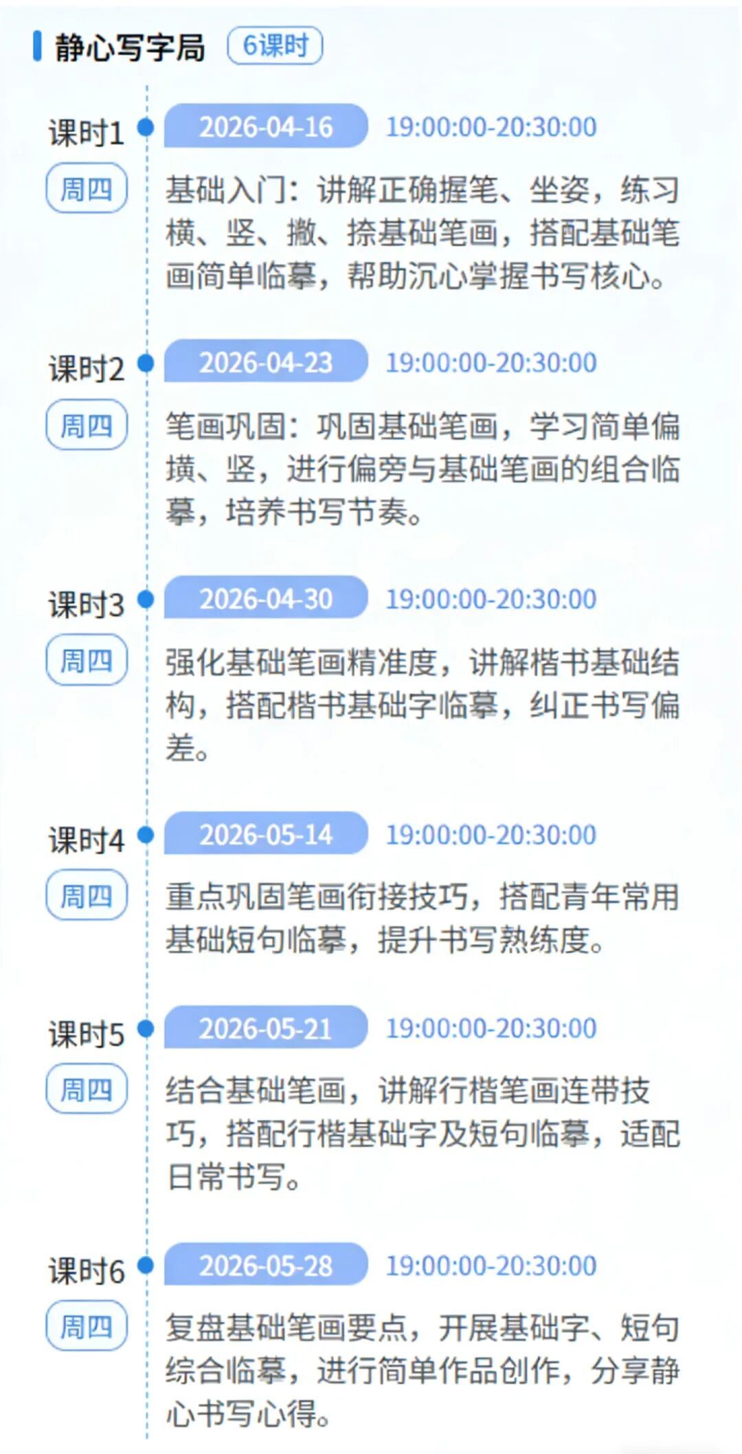 本期课程4月13日至5月29日,共6次课,一周1次,连续6周完成(遇节假日顺延或取消)