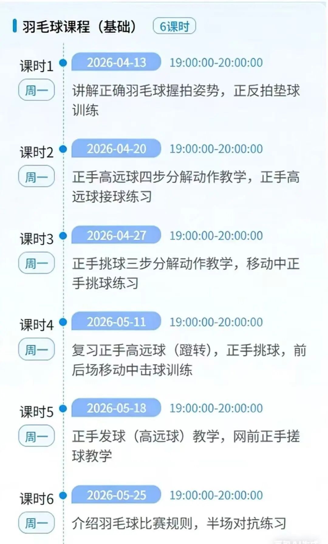 本课程专为羽毛球新手打造,包含初识羽毛球、基础动作学习、简单对战三大模块。系统学习羽毛球基础技能,学会正确握拍、发球和简单击球,了解基本规则,独立应对简单对战场景,提升身体反应能力和协调性,增强对羽毛球的兴趣。
