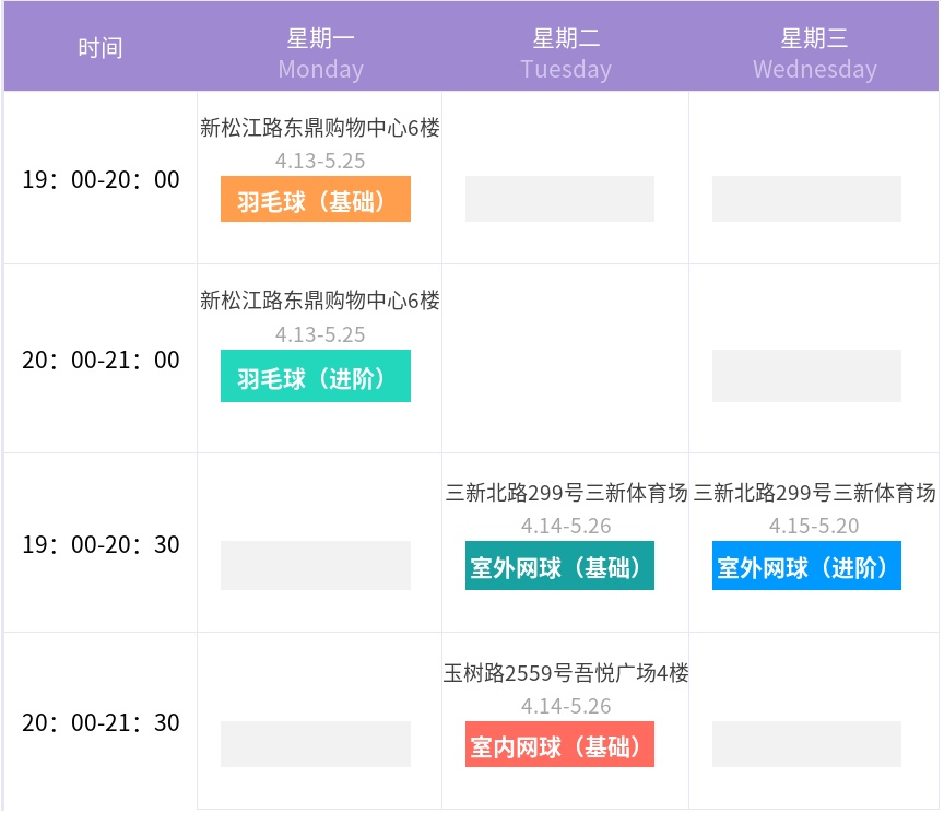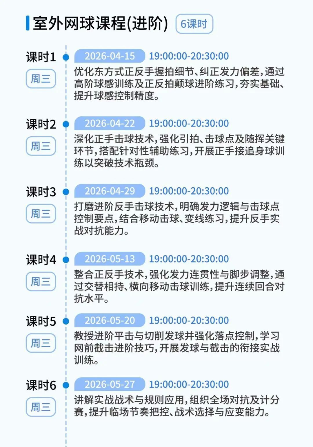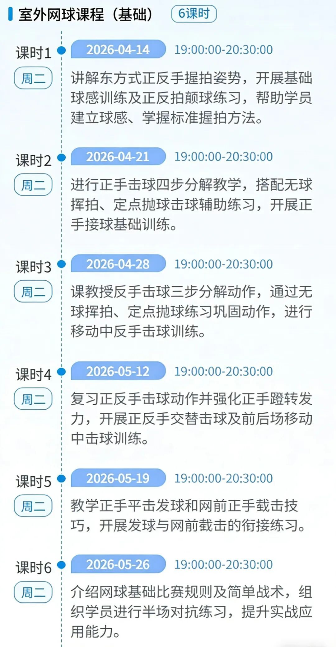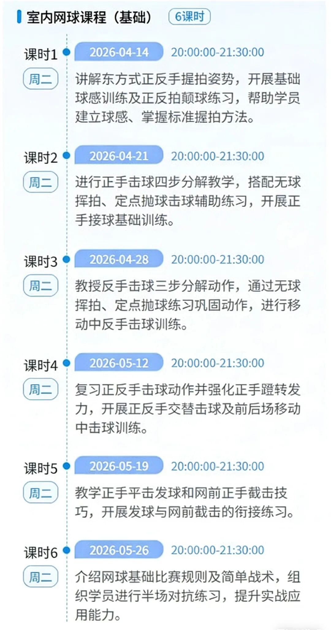 其中,室内网球(基础)课程3月30日17时开始报名。