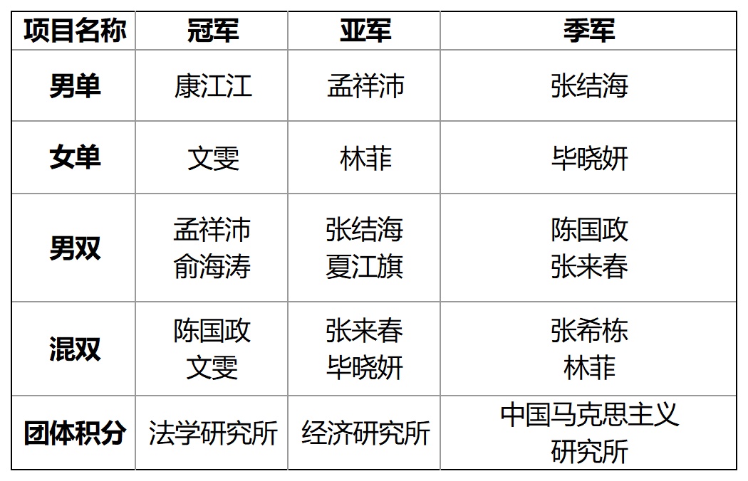 本次比赛除单男、女单、男双和混双四个单项的正赛外,还增设了趣味赛环节,吸引来自我院各单位和部门的共计154名职工踊跃报名参加。大家以球竞技、以赛联谊,在运动中展现社科人昂扬向上、奋勇拼搏的精神风貌。