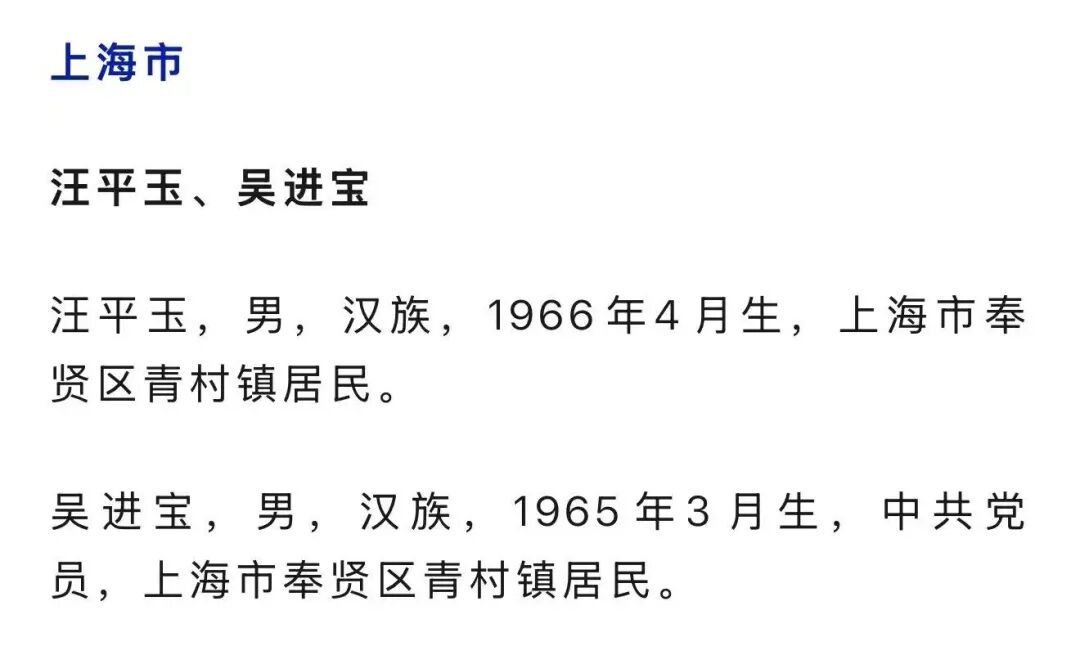 汪平玉,男,汉族,1966年4月生,上海市奉贤区青村镇居民。吴进宝,男,汉族,1965年3月生,中共党员,上海市奉贤区青村镇居民。