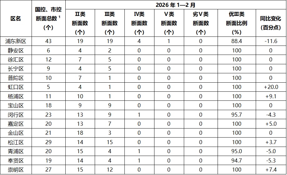 注:全市国控、市控断面中,涉及各区考核的断面共272个(奉贤区、浦东新区共考断面1个,黄浦区无地表水国控、市控断面)。2026年1—2月,普陀区2个市控断面受河道施工影响停测,不参与优Ⅲ类断面比例统计。