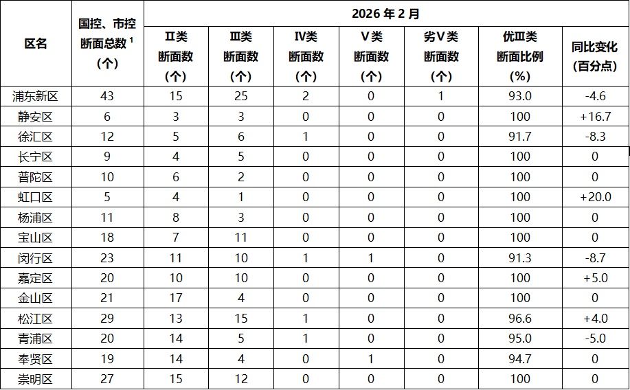 2026年2月,浦东新区有1个断面为劣Ⅴ类、2个断面为Ⅳ类,闵行区有1个断面为Ⅴ类、1个断面为Ⅳ类,奉贤区有1个断面为Ⅴ类,徐汇区、松江区、青浦区各有1个断面为Ⅳ类,其余各区所有地表水断面均达到优Ⅲ类。与2025年同期相比,长宁区、普陀区、杨浦区、宝山区、金山区、崇明区优Ⅲ类断面比例保持在100%,静安区、虹口区、嘉定区、松江区优Ⅲ类断面比例有所上升,浦东新区、徐汇区、闵行区、青浦区优Ⅲ类断面比例有所下降,奉贤区优Ⅲ类断面比例持平。
